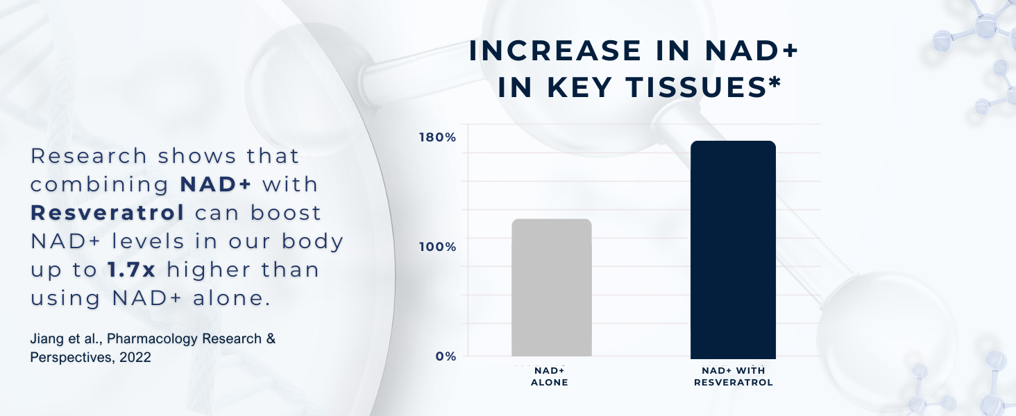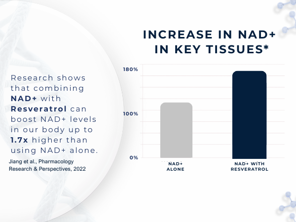 Significant rise in your body's overall NAD+ pool. You may notice reduced fatigue, and improved stamina & focus.*